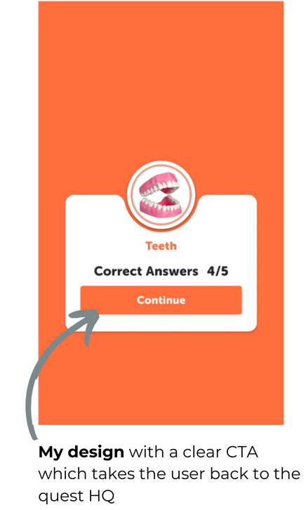 What was launched. The quiz was built in a web browser, not natively in the mobile app. With no web developer available, we had to work within the existing framework, using the close icon to take the user to the quest HQ